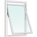 Här sitter gångjärnen i bågens överkant. Detta är en vanlig lösning i till exempel källare, garage och andra ställen där det av olika skäl bli opraktiskt med vridbara fönster.